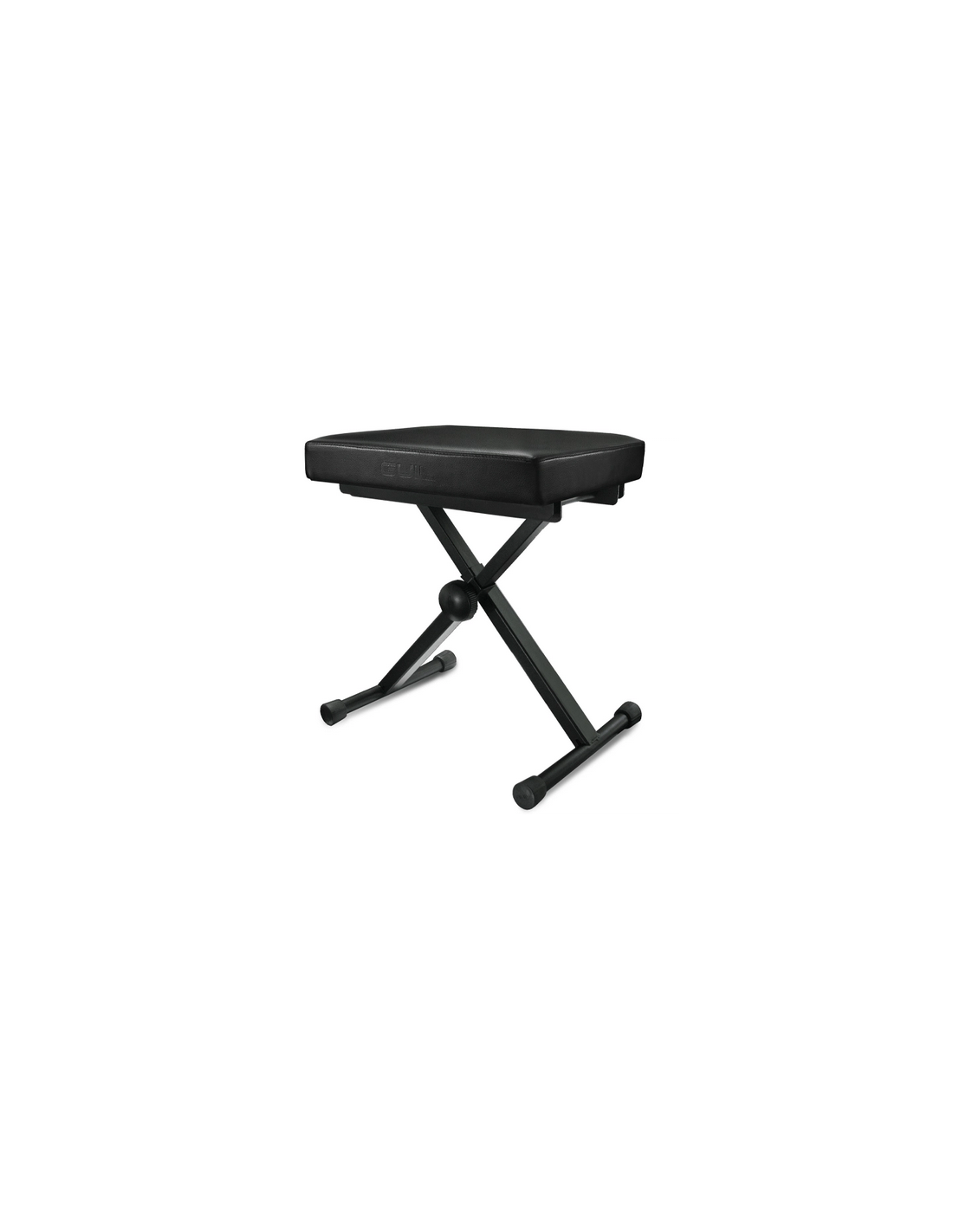 Banqueta para teclado con asiento rectangular tapizado en piel sintética. Su asiento reforzado, de mayor espesor y con base de tablero contrachapado, está fabricado con espuma de alta densidad para una mayor comodidad y confort del teclista.