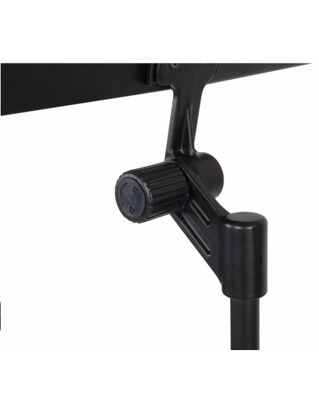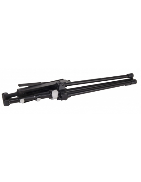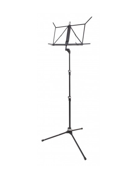 Atril profesional ultraligero con tres secciones totalmente plegables. Construido en acero, con base de trípode, articulaciones intermedias y bloque superior de aluminio fundido a presión, que garantizan una gran estabilidad. Todas las piezas deslizantes interiores están fabricadas en nailon de alta calidad que permiten ajustes sencillos y precisos. Se suministra con bolsa de nylon incluida para facilitar su transporte. Color negro.