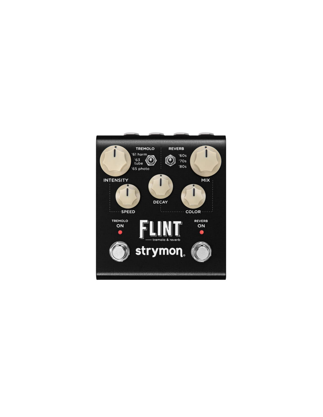 'El perfecto caballero de una época clásica. La combinación mágica de tremolo y reverb es el primer ejemplo de maridaje perfecto de efectos de guitarra. Desde los históricos amplificadores de los 60, esta armoniosa coexistencia ha hecho camino en incontables grabaciones y directos. Flint proporciona los relajantes, pulsantes e hipnóticos efectos de los circuitos de tremolo de amplificadores vintage junto con tres clásicos y totalmente únicos algoritmos de reverb. Tienes el musicalmente complejo 61 Harmonic Tremolo, el pantanoso y sensual 63 Power Tube Tremolo y el afilado y equilibrado 65 Photocell Tremolo. También tienes el clásico 60s Spring Tank. Reverb, la original 70s Electronic Plate Reverb y la nostálgica 80s Hall Rack Reverb. Cuatro controles adicionales ''escondidos'' permiten manejar: Tremolo Boost/Cut , Reverb Boost/Cut, Orden de los efectos y Tap Subdivision. Dos potenciómetros para ajustar el Tremolo: Intensity y Speed. Tres potenciómetros para la Reverb: Decay, Color y Mix. Bypass individuales para Tremolo y Reverb. Posibilidad de usar la entrada del Flint en estéreo con un adaptador. Función secundaria Boost/Cut ajustable / 3dB cuando se activa el efecto. Alimentador incluido.'