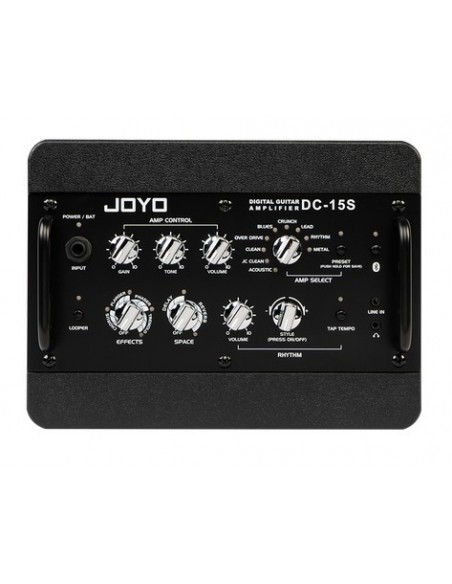 Controles: ganancia, tono, volumen (para amplificador), efectos espaciales, efecto de modulación, selección de amplificador, preajuste de amplificador, Bluetooth, Looper, volumen de batería, estilo de batería, tap tempo