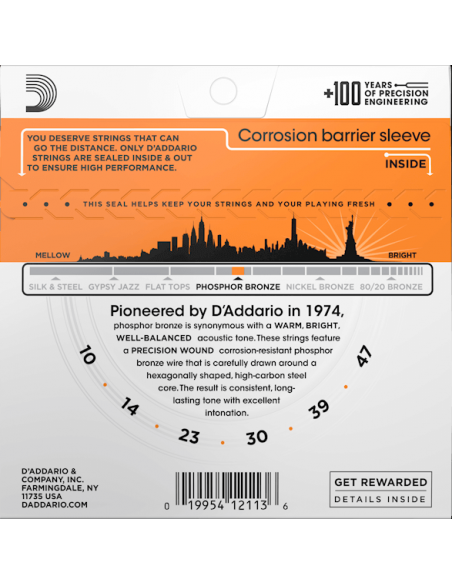 D'Addario fue el primero en utilizar Phosphor Bronze en cuerdas de guitarra acústica en 1974. Hoy en día, el Fósforo Bronce se toca en todo el mundo y se considera el estándar en cuerdas acústicas, gracias a su hermoso equilibrio sónico y calidez tonal. Estas pioneras cuerdas Phosphor...