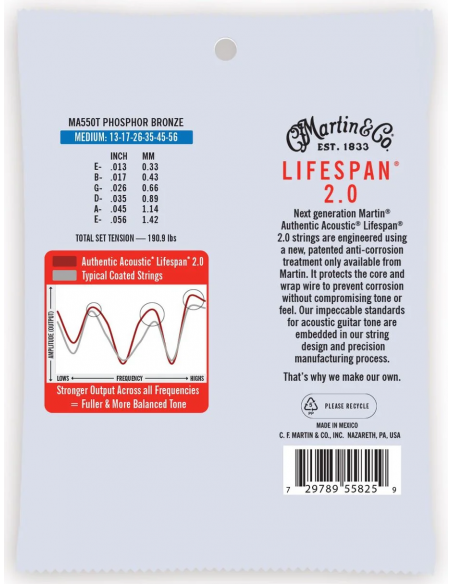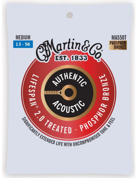 La nueva generación de cuerdas Martin® Authentic Acoustic® Lifespan® 2.0 han sido diseñadas con un tratamiento anticorrosión patentado, sólo disponible en Martin. Protege el núcleo y el alambre de envoltura para evitar la corrosión sin comprometer el tono o la sensación.