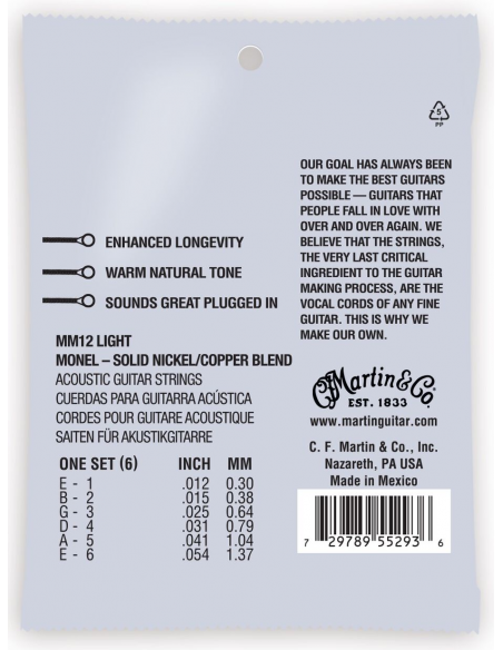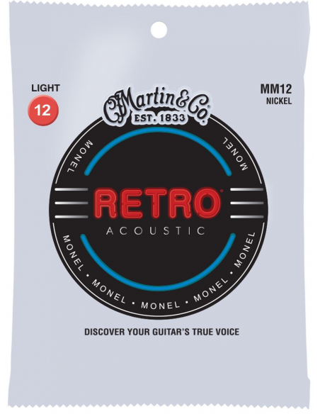 Las cuerdas Retro® de Martin son las auténticas. Con las cuerdas Retro® de Martin, obtienes un juego resistente que ofrece un tono verdadero y consistente y suena como ninguna otra cosa en el mercado. La mezcla de níquel y cobre de Martin proporciona un ataque de púa reducido que permite que las tonalidades de la guitarra se escuchen, no se ensombrezcan. El alambre de Monel patentado por Martin es naturalmente resistente a la corrosión, por lo que puede tocarlas durante mucho tiempo sin que nada se interponga en el camino de su música. Descubra la verdadera voz de su guitarra. Las cuerdas Retro® ofrecen una mayor longevidad con un tono cálido y natural, y suenan muy bien enchufadas.