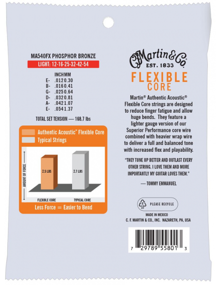 Las cuerdas Martin® Authentic Acoustic® Flexible Core están diseñadas para reducir la fatiga de los dedos y permitir enormes bends. Presentan una versión de calibre más ligero de nuestro alambre de núcleo Superior Performance combinado con un alambre de envoltura más pesado para ofrecer un tono completo y equilibrado con una mayor flexibilidad y facilidad de ejecución. Nuestros impecables estándares para el tono de la guitarra acústica están integrados en nuestro diseño de cuerdas y el proceso de fabricación de precisión. Por eso las fabricamos nosotros mismos.
