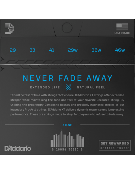 Las XT son las cuerdas más duraderas, combinando siglos de experiencia de D'Addario con la moderna tecnología de revestimiento "Coating". XT Classical cuenta con bajos compuestos, construidos con un núcleo multifilamento de larga duración, envueltos con cobre plateado y acabados con revestimiento XT patentado, para un tono audaz y proyector y una mayor vida útil. Se complementan con cuerdas agudas de nylon de precisión Pro-Arte', que proporcionan el encanto cálido y suave que los tradicionalistas adoran. Este juego de tensión dura proporciona un tono rico y una proyección fuerte.