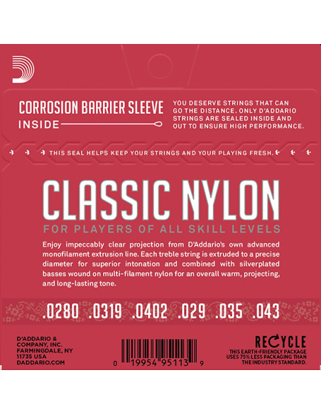 Las cuerdas D'Addario Classic Nylon Student están diseñadas específicamente para guitarristas clásicos principiantes. La combinación tradicional de cobre plateado enrollado sobre nylon y agudos de nylon transparente, aporta un equilibrio encantadoramente suave, que toca la fibra sensible de los estudiantes. Las cuerdas de tensión normal son las más vendidas y las preferidas por su equilibrio entre tono rico, tacto cómodo y proyección dinámica.