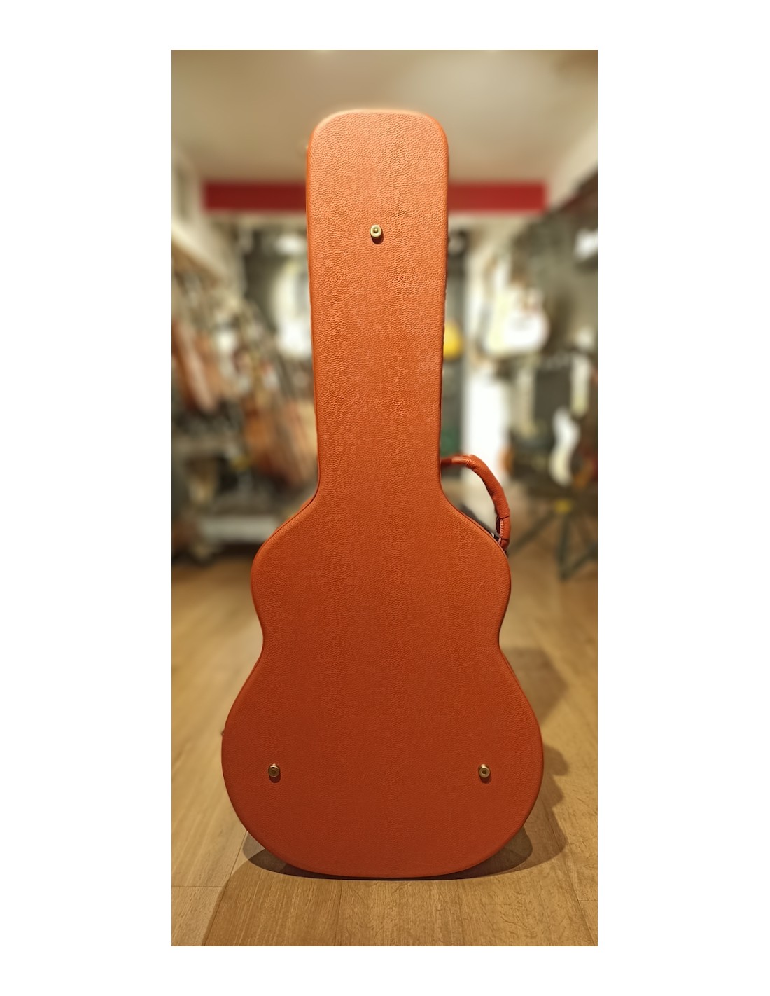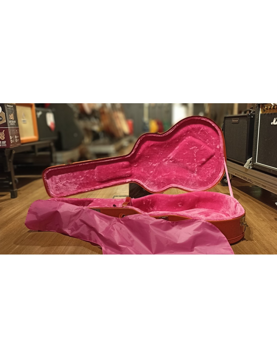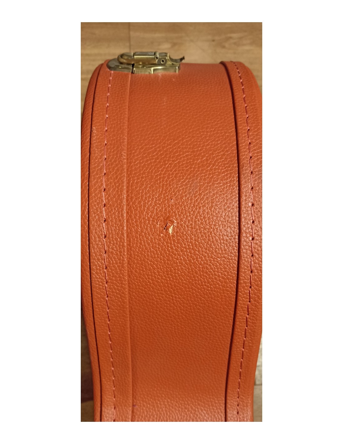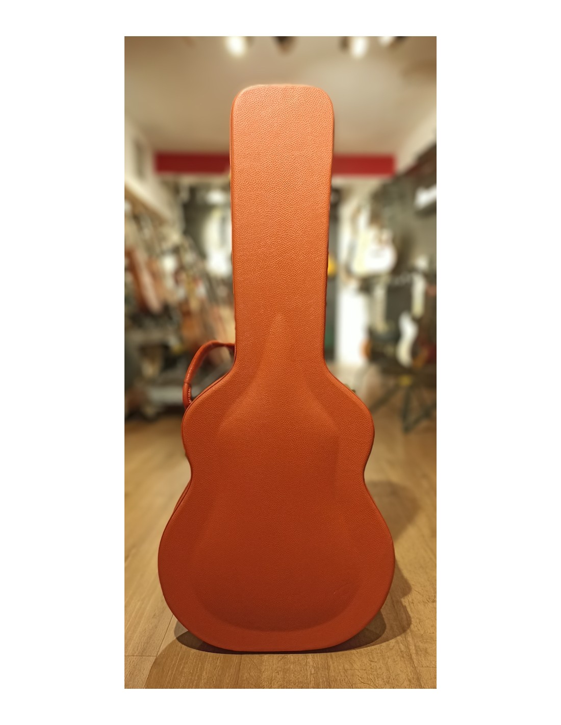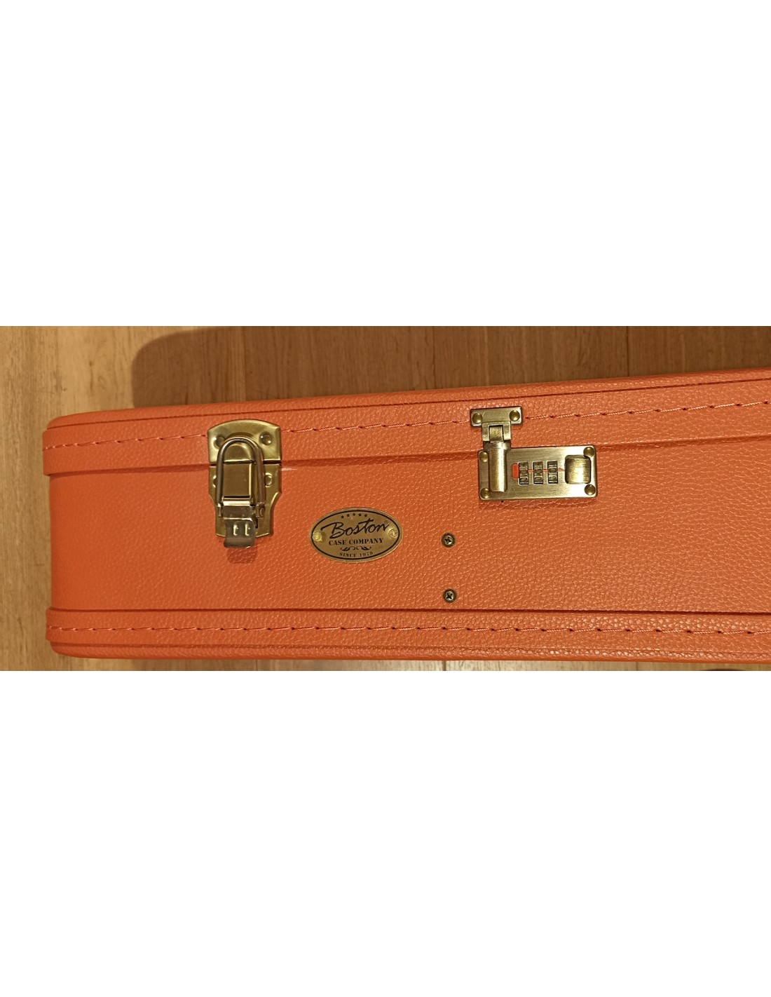 Estuche rígido Boston para guitarras tipo Jumbo. Tono naranja/marrón vintage con interior de felpa rosa.