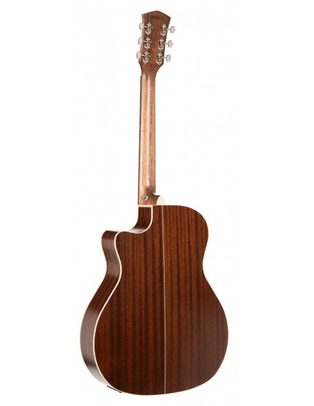 La tapa de abeto Sitka macizo torrefactado es el corazón de su tono, produciendo un sonido rico y cálido que se equilibra perfectamente con el fondo y los aros de caoba. Esta combinación de maderas selectas garantiza una resonancia profunda y una claridad cristalina en cada nota.