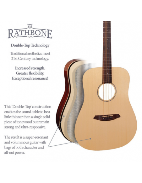 La R5SM Rathbone Dreadnought 'Double Top' cuenta con una tapa de resonancia tecnológicamente avanzada hecha de dos capas superfinas de abeto con un entramado de fibra de carbono entre ellas.