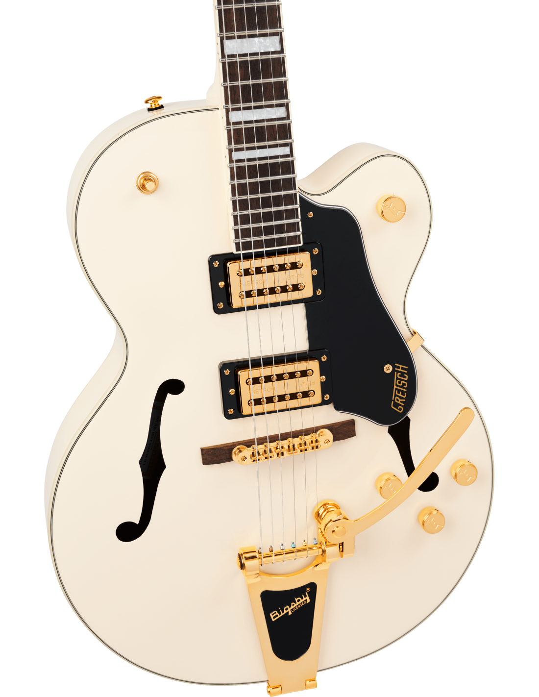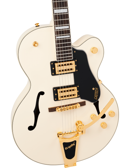 Las pastillas Broad'Tron BT-3S proporcionan un tono moderno y equilibrado, mientras que el Bigsby B60 añade ese vibrato clásico que solo Gretsch sabe ofrecer. Su hardware dorado y los inlays Big Block la convierten en una guitarra que no solo suena increíble, sino que también destaca visualmente.