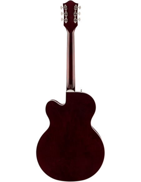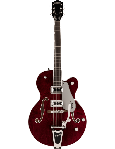La G5420T también cuenta con una versátil y mejorada disposición de los controles, incluyendo el volumen maestro con circuito de recorte de agudos, el tono maestro, los controles de volumen de las pastillas individuales y el interruptor de palanca de tres posiciones para las pastillas, los agujeros F de gran tamaño, un cuerpo de varias capas, un clavijero más pequeño de finales de los 50 para la G6120, clavijas abiertas de estilo vintage, tuerca Graph Tech® NuBone®, incrustaciones perladas Neo-Classic™, un puente Adjusto-Matic™ seguro y un cordal Bigsby® B60 para vibrato.