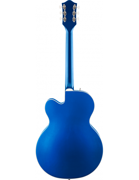 La G5420T también cuenta con una versátil y mejorada disposición de los controles, incluyendo el volumen maestro con circuito de recorte de agudos, el tono maestro, los controles de volumen de las pastillas individuales y el interruptor de palanca de tres posiciones para las pastillas, los agujeros F de gran tamaño, un cuerpo de varias capas, un clavijero más pequeño de finales de los 50 para la G6120, clavijas abiertas de estilo vintage, tuerca Graph Tech® NuBone®, incrustaciones perladas Neo-Classic™, un puente Adjusto-Matic™ seguro y un cordal Bigsby® B60 para vibrato.