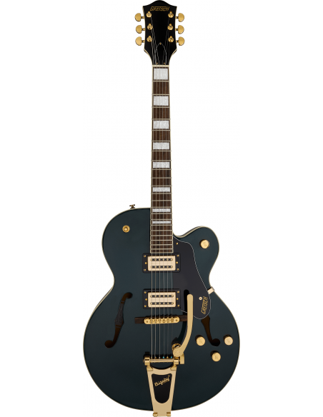 La Edición Limitada G2420TG Streamliner Hollow Body Single-Cut con Bigsby® está diseñada para el guitarrista moderno que anhela algo más allá de la norma. Con hardware dorado brillante, mandos de control G-Arrow metálicos e incrustaciones Big Block perladas, los modernos sonidos, la electrónica actualizada y el estilo auténticamente elegante de la G2420TG crean la última iteración de That Great Gretsch® Sound’.