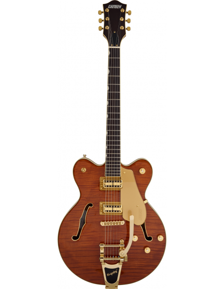 Presenta un hermoso cuerpo de okoume flameado con doble cutaway, un diapasón de palosanto, pastillas USA Full’Tron™, controles con incrustaciones tipo "G-Arrow" y herrajes dorados. El estilo sofisticado y el sonido premium de esta Broadkaster® de Edición Limitada son la combinación perfecta para destacar en cualquier escenario.