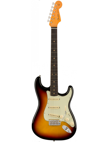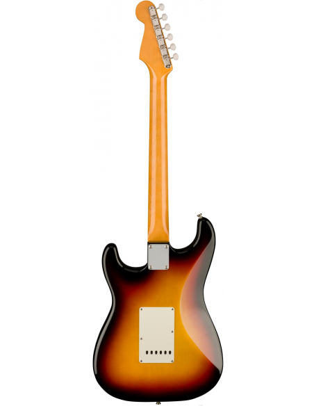 Durante finales de los años 50 y principios de los 60, la popularidad de los instrumentos musicales Fender floreció y, aunque la variedad de Fender se había ampliado para incluir muchos instrumentos nuevos y fantásticos, la Stratocaster® reinaba por encima de todo. Para 1961, la Stratocaster había adquirido una estética más refinada, con un Sunburst de 3 colores reformulado con un rojo más vibrante y un borde negro más audaz, rematado con un golpeador de 3 capas que acentuaba las curvas características de la Stratocaster.