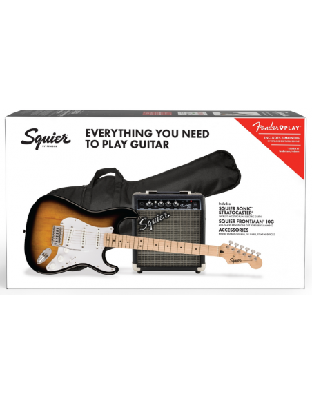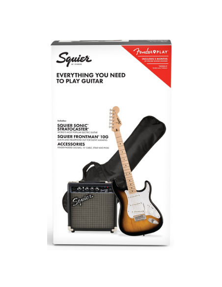 El pack Squier Sonic® Stratocaster® Pack está listo para lanzar cualquier aventura musical a la velocidad de la luz, ofreciendo a los nuevos músicos una conveniente colección de elementos esenciales de guitarra en un solo pack. Un ícono de la historia de la música y una excelente opción para los principiantes, la Stratocaster es reconocida por su elegante y cómodo cuerpo contorneado y su mástil delgado y fácil de tocar. Tres pastillas de bobina simple producen un tono inspirador y versátil perfecto para cualquier género musical y un puente de trémolo invita a efectos de vibrato expresivos que seguramente despertarán la creatividad. El amplificador Squier® Frontman® 10G compacto y portátil cuenta con canales limpios y overdrive, ecualizador de dos bandas para control de tono, conector para auriculares para practicar en silencio y una entrada auxiliar para conectar un dispositivo multimedia. También se incluyen una funda acolchada, cable de instrumento, correa y púas, así como una suscripción gratuita de 3 meses a Fender Play®, la forma más fácil de aprender a tocar la guitarra.