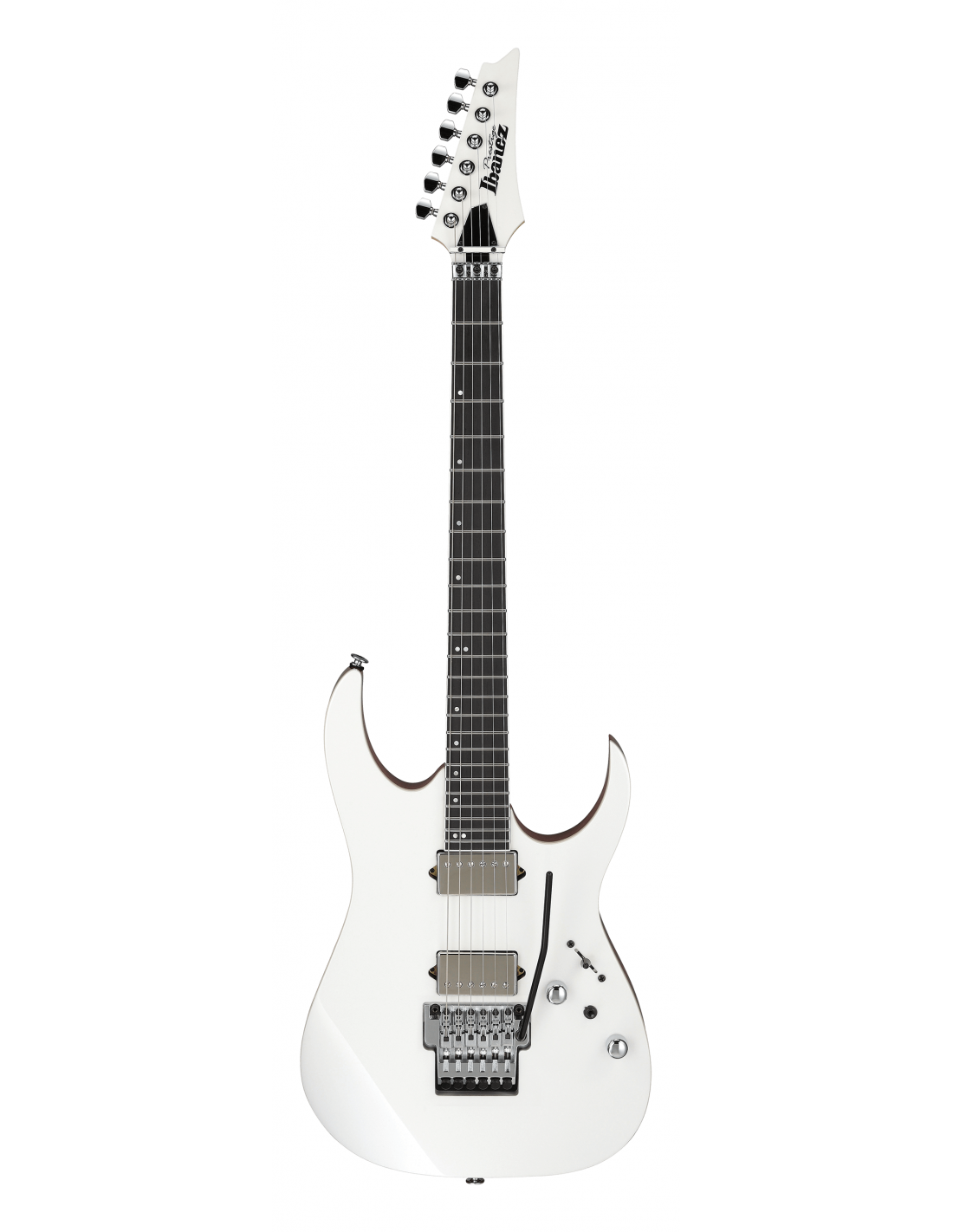 El RG5320C presenta un cuerpo de caoba africana atornillado a un mástil de arce y wengué con un diapasón de ébano de Macassar con 24 trastes de acero inoxidable, marcadores de posición de puntos de nácar desplazados y puntos laterales luminiscentes. Los componentes incluyen un par de pastillas humbucking DiMarzio, un puente de trémolo de doble bloqueo Lo-Pro Edge y clavijas de afinación Gotoh.