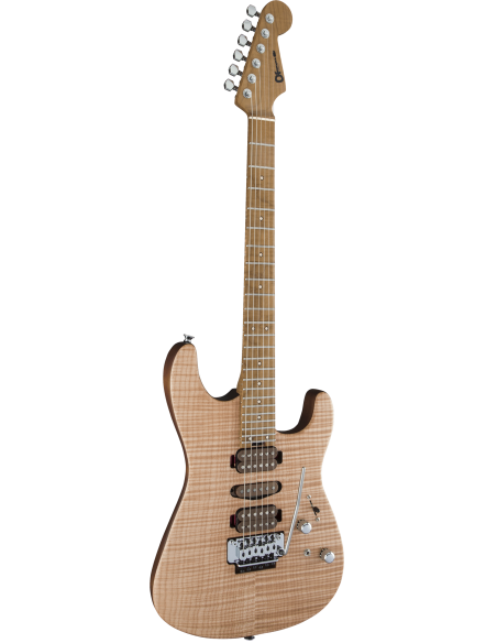 Con una escala de 25,5", la Guthrie Govan USA Signature HSH Flame Maple ofrece un cuerpo de tilo caramelizado San Dimas® coronado por un precioso arce flameado con un fino acabado de uretano satinado y un talón especialmente contorneado (sin placa de mástil) para facilitar el acceso a la parte superior del diapasón. El mástil de arce flameado atornillado tiene un tratamiento térmico y de secado "caramelizado" que hace que suene y se sienta mucho más antiguo, junto con un refuerzo de grafito, un acabado de uretano frotado a mano en la parte posterior del mástil y una práctica rueda de ajuste de la varilla del alma montada en el talón. De forma inusual para un modelo San Dimas, el diapasón de arce flameado de radio compuesto de 12"-16" abarca dos octavas, con el mismo tratamiento caramelizado que el mástil, 24 trastes extra jumbo de acero inoxidable e incrustaciones especiales de puntos de arce con bordes de ébano, así como puntos laterales Luminlay® que emiten luz para los escenarios más oscuros.