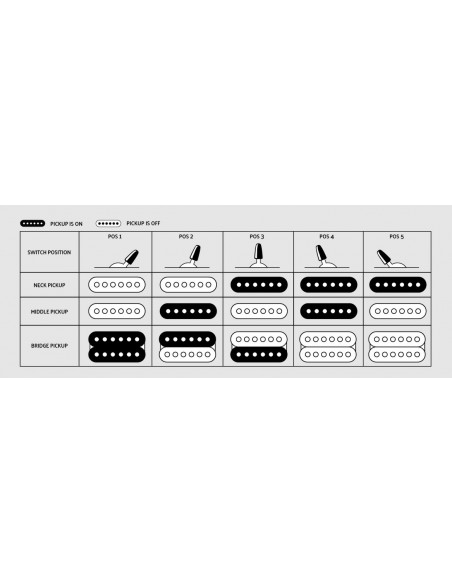 | Pickup Switching | 5-Position Blade: Position 1. Full Bridge Pickup, Position 2. Bridge Inner Coil and Middle Pickup, Position 3. Bridge Outer Coil and Neck Pickup, Position 4. Middle and Neck Pickup, Position 5. Full Neck Pickup |