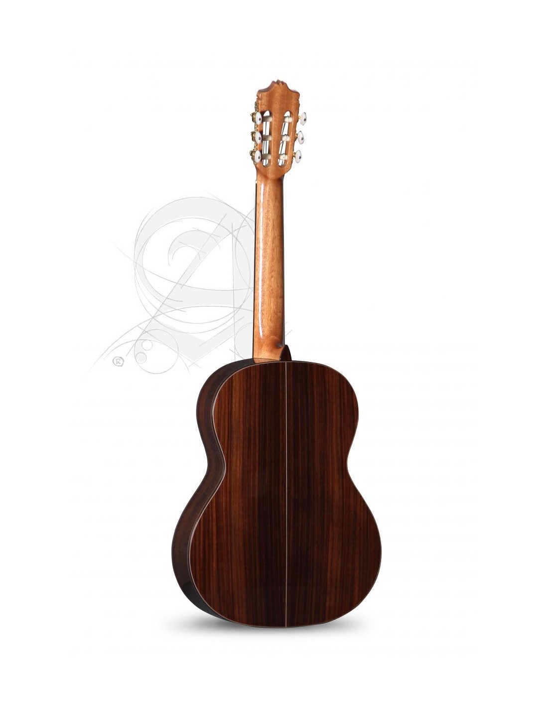 Completamente elaborado a mano con maderas macizas, el modelo 7 P A está construido con Abeto Alemán en la tapa, ébano para el diapasón y Palosanto de la India para el fondo y los aros.