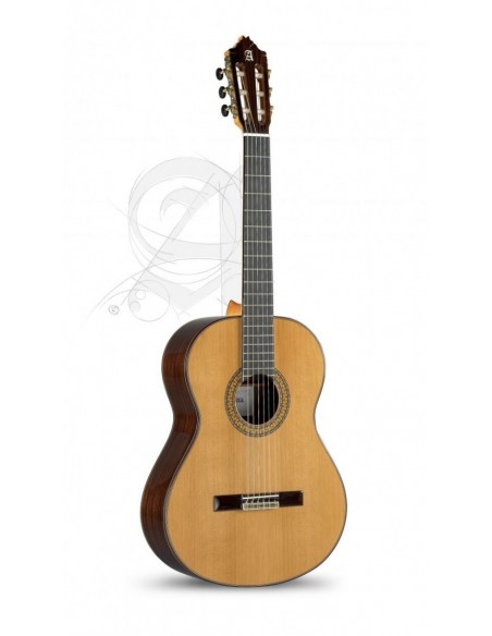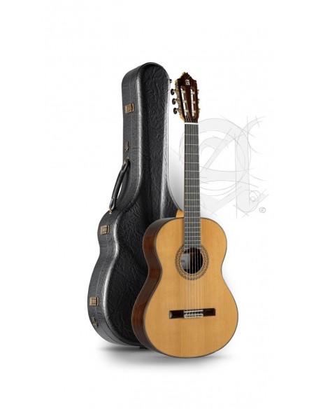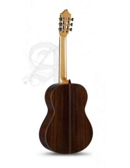 Precisamente en los acabados de este modelo se puede observar el importante trabajo artesanal donde, combinado con un precioso Palosanto de India y una tapa de Cedro rojo seleccionada, se consigue un instrumento con una imagen refinada y de altas prestaciones.