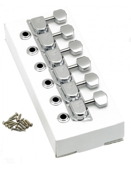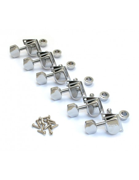 Las clavijas para una guitarra Fender 70's F-Style Strat/Tele probablemente adoptarán un diseño que refleje la estética de la década de 1970. Pueden tener un aspecto vintage, con detalles cromados envejecidos o acabados que recuerden la época.