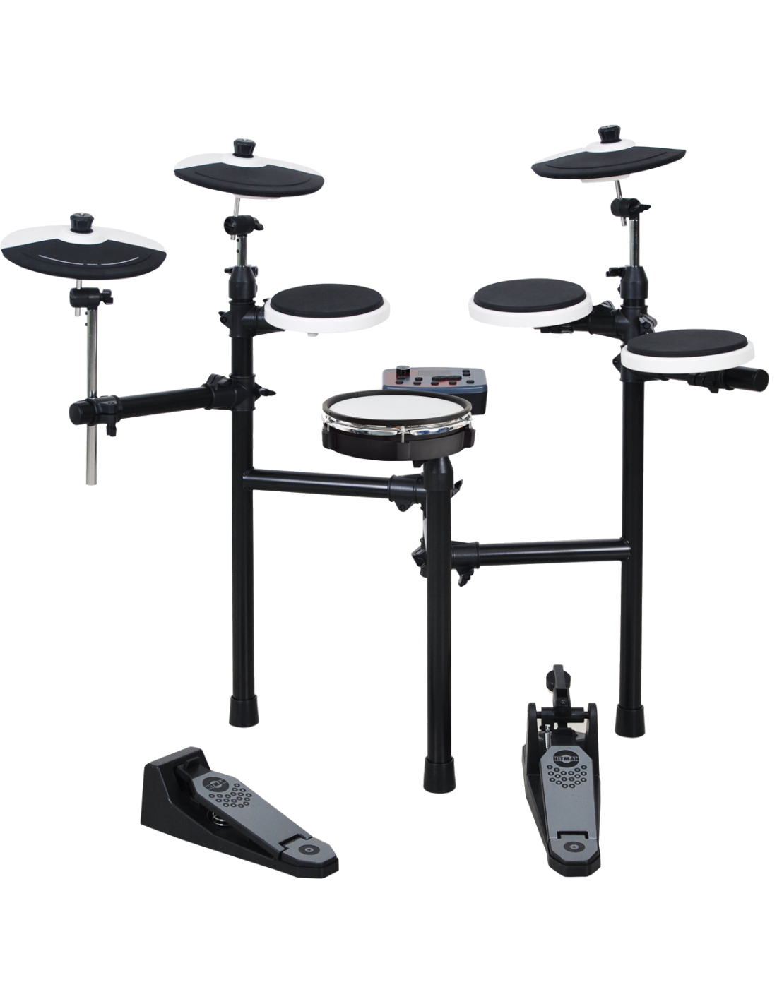 Incluye pads de 8 pulgadas (caja, timbales, platos y bombo) y pedales de hi-hat y bombo.