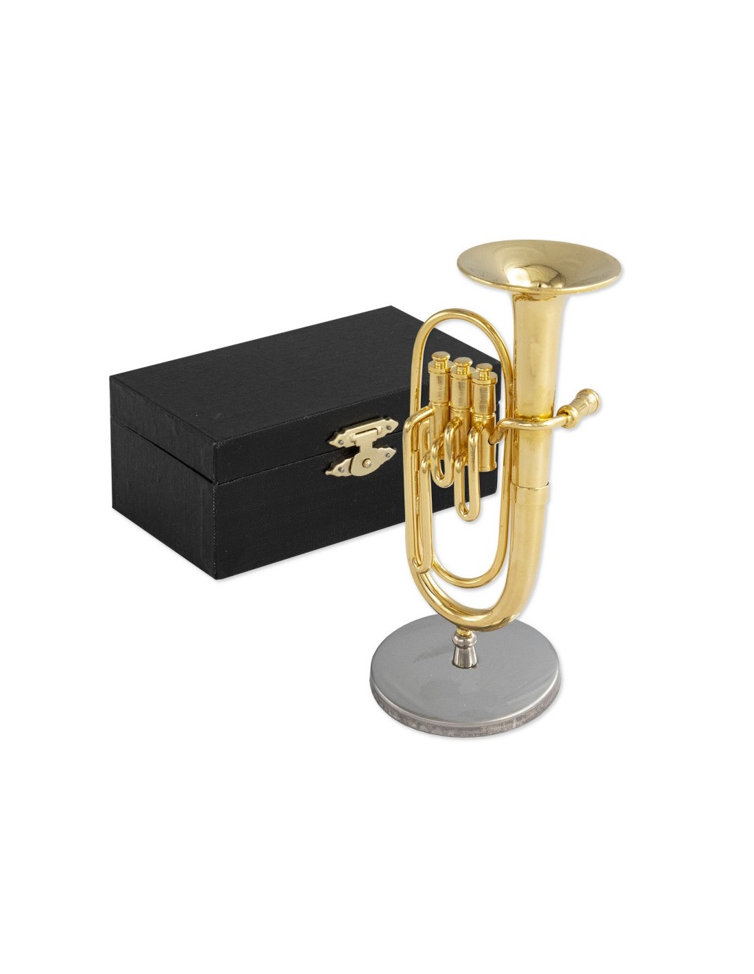 Trombón metálico decorativo miniatura. Con soporte metálico y estuche.