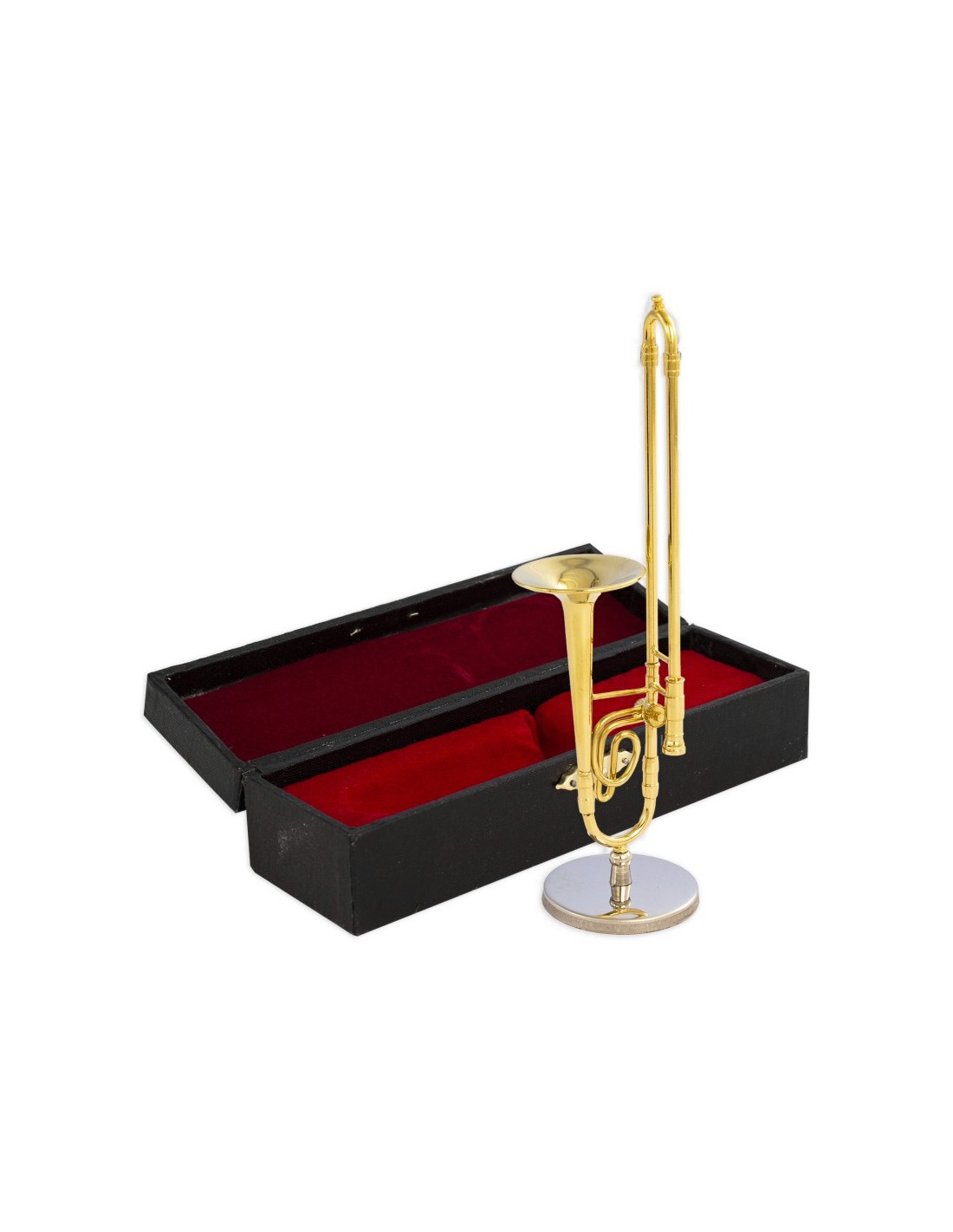 Trombón metálico decorativo miniatura. Con soporte metálico y estuche.
