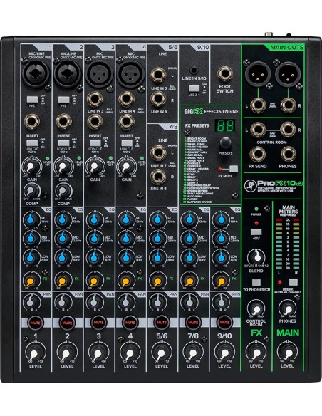 Mesa de mezclas profesional de 12 canales . 7 previos de micrófono Mackie ONYX + 60db GAIN con 2 COMBO Hi-Z , phantom y 3 band con 4 knobs de compresion Low cut , Insert y fx footswitch. pre-fader Solo, AUX/MONITOR OUTPUT, Stereo Subgrup bus output.salida de auricualres con control propio. Nuevo Procesador GigFX con 24 efectos de alta calidad. Interface...