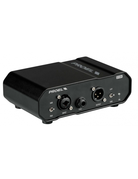 El D10A es una caja directa activa con transformador y requiere alimentación fantasma para funcionar. La ventaja de un transformador es la posibilidad de evitar cualquier conexión eléctrica entre la fuente de sonido y la mesa de mezclas. Esto proporciona dos enormes beneficios: sin ruta eléctrica, se eliminan los bucles de tierra y es posible la cancelación del ruido de modo común, como el zumbido. La ventaja de una caja DIBOX activa en lugar de pasiva es una pérdida de inserción nula y menos zumbido y ruido de salida.