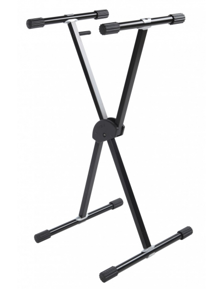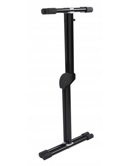 Soporte de teclado de construcción robusta y resistente con refuerzo simple. Con tubos de acero de alta calidad y uniones de aluminio fundido a presión que garantizan la máxima fiabilidad. Provisto de un nuevo mecanismo de liberación fácil mediante el toque de una palanca que permite un ajuste rápido y la selección de una de las cuatro posiciones de altura diferentes. Se suministran tapones de goma autonivelantes para el ajuste en superficies irregulares y garantizar una estabilidad adicional. Se suministra desmontado para facilitar su transporte. Color disponible: negro mate con inserción gris.